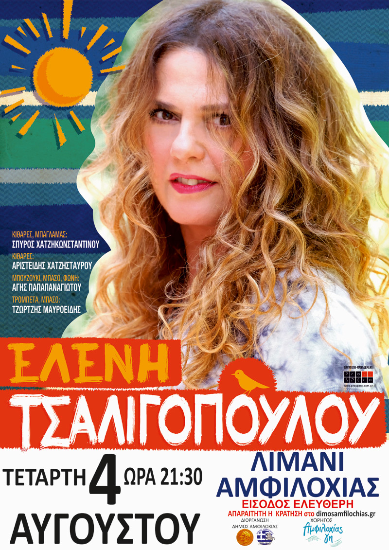Κορίτσι και Γυναίκα ονομάζεται η νέα σειρά συναυλιών που έχει ετοιμάσει για αυτό το καλοκαίρι η Ελένη Τσαλιγοπούλου και την παρουσιάζει στην Θεσσαλονίκη στο Φεστιβάλ Μονής Λαζαριστών μαζί με τους Boggaz Μusique που τη. Κάθε βδομάδα στο e-mail σας τα τελευταία νέα για την Τέχνη και τον Πολιτισμό. Την Πέμπτη 8 Αυγούστου η Ελένη Τσαλιγοπούλου εμφανίζεται στο Θέατρο Κοκόλας στον Κερατόκαμπο Βιάννου στο Ηράκλειο Κρήτης στο πλαίσιο των.